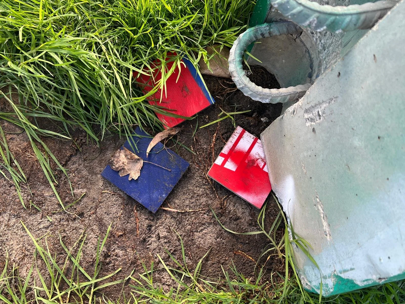 It takes a month or two to deconstruct the track after the event. This year on my frequent walks around the park I began to notice and pick up discarded signage. These are old signs from previous years that have been cut up and used to level up the concrete track barricades. They are 1/2 buried, covered in mud but with a good scrub they still have a story to tell.